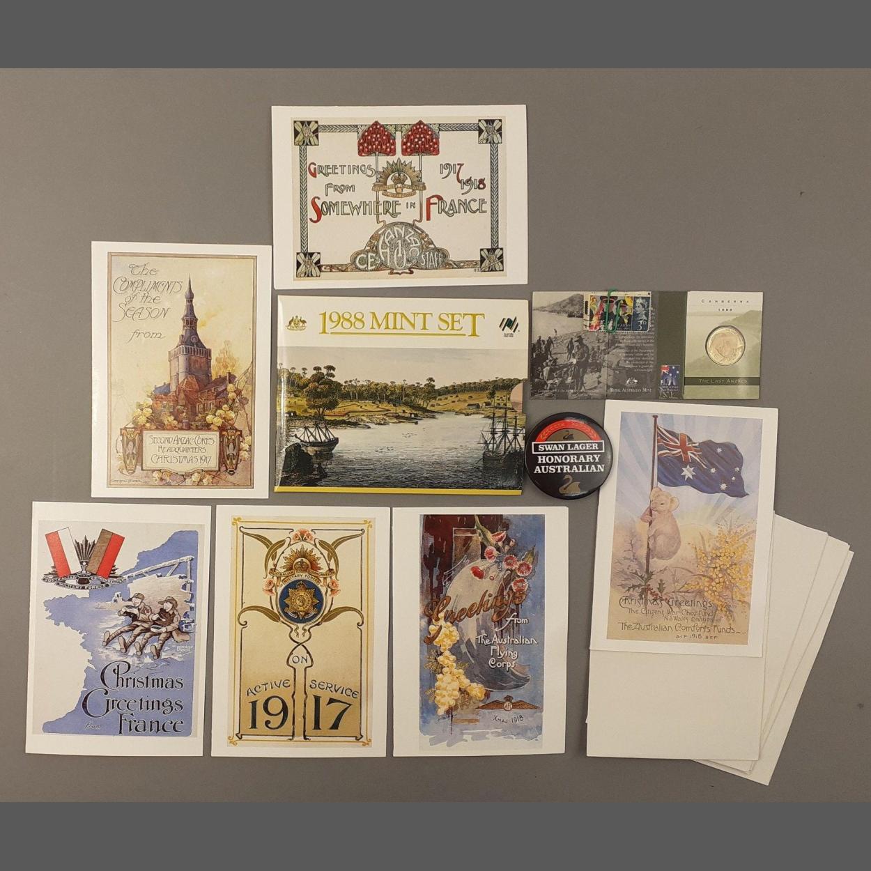 An Australia 1988 mint coin set with 2 bills in, however creased, 1999 Aztec dollar reproduction postcards and a badge