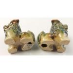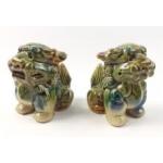 A pair of ornamental glazed Oriental Foo dogs ceramic with green, blue and brown hues.