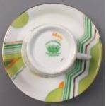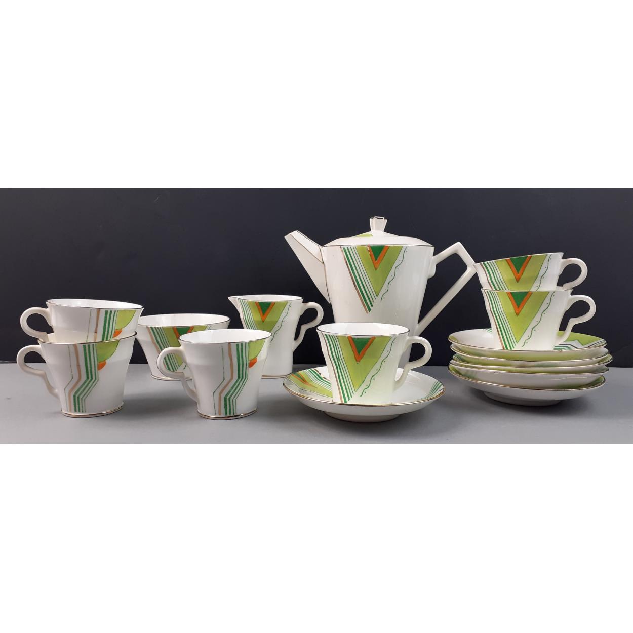 Art Deco coffee set made in England by Taylor and Kent comprising coffee pot, cream jug, sugar bowl and 6 coffee cups and saucers with green and orange design.