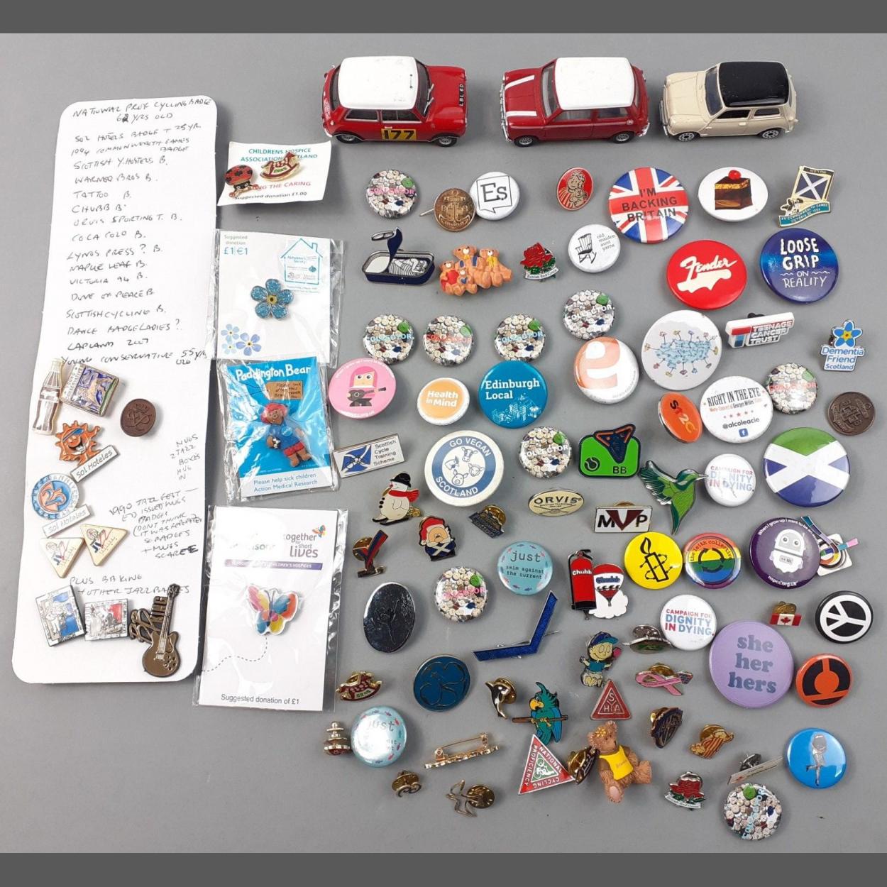 A large collection of pin badges including 1990 Jazz Fest, to include brass/enamel type pin badges as well as 3 Mini Cooper diecast cars