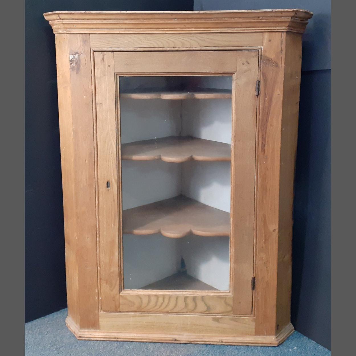 An ANTIQUE pine corner cabinet c1890 with glazed door and four shelves - 100cm height x 80cm width x 45cm depth approx