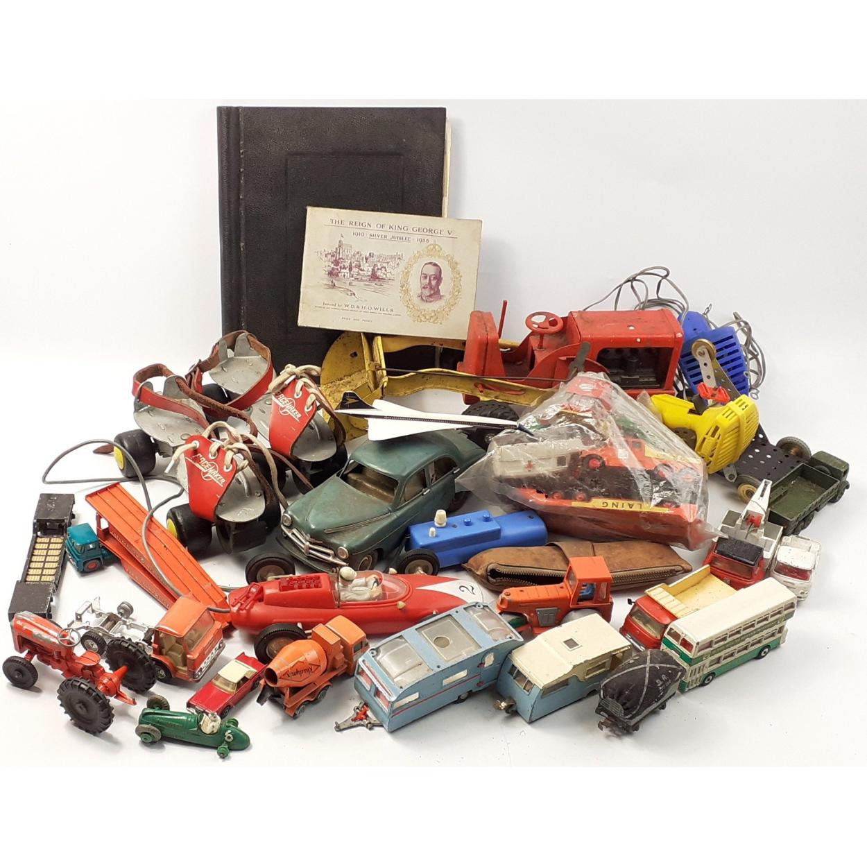 A box of childhood memories to include roller skates, a Tri-Ang digger, a Marx racer, and some 1970s diecast including James Bond Corgi 007 Aston Martin, a post-on caravan, marbles, and a stamp album. Mostly play worn