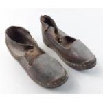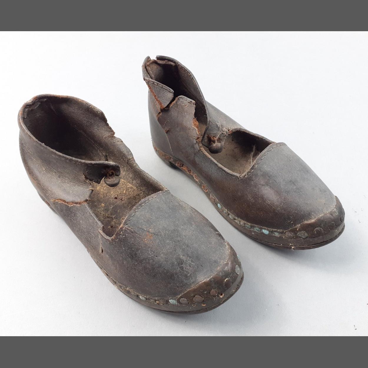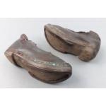 A small pair of child's antique leather clogs with wear. Very cute and lovely on a shelf.