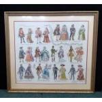A beautifully worked large cross stitch picture of costumes through the ages 1450-1900, frame measures 97x90cm