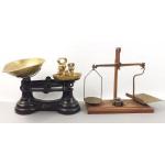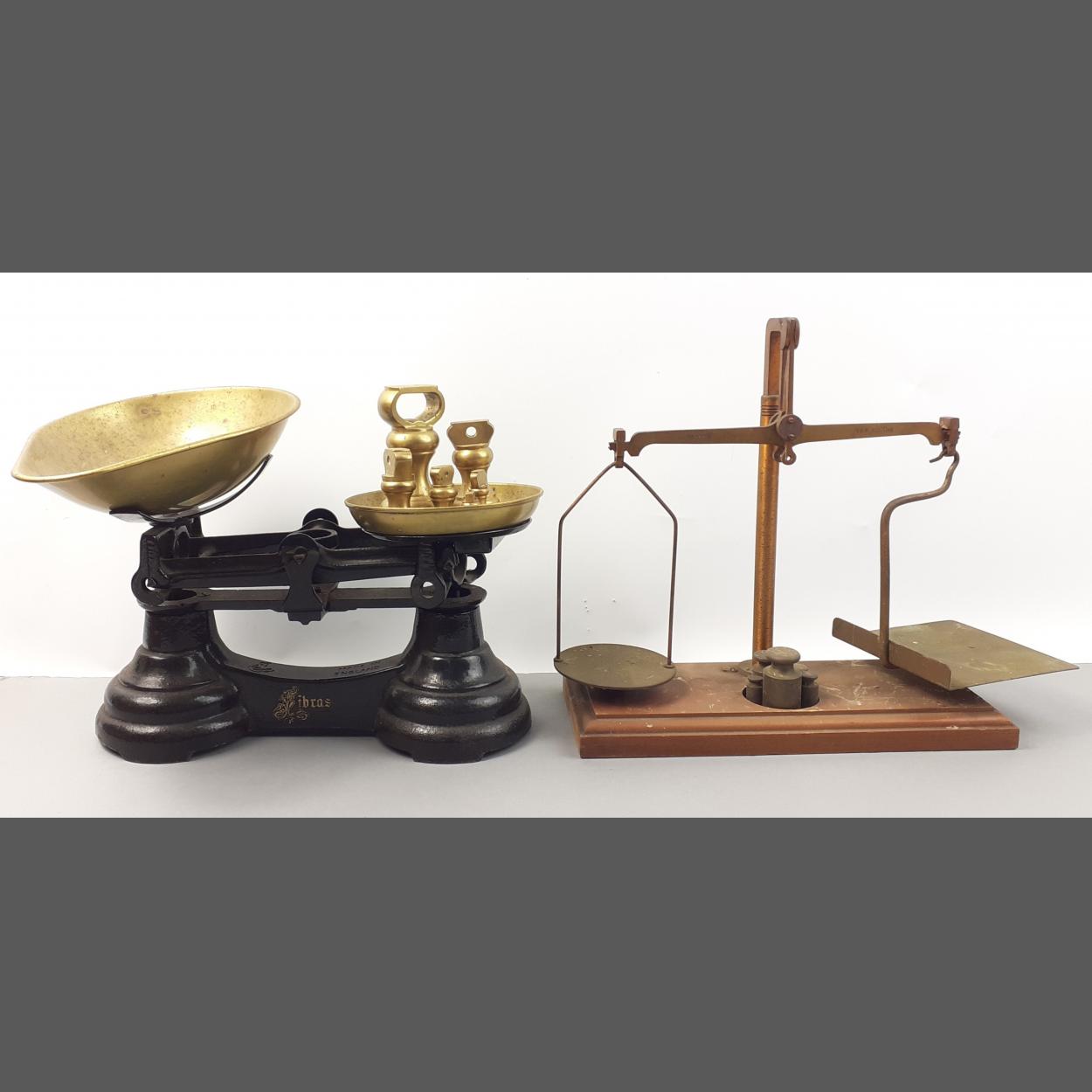 Two sets of vintage balance scales with weights, one a postal scale in quite poor condition and a brass set (Libra)