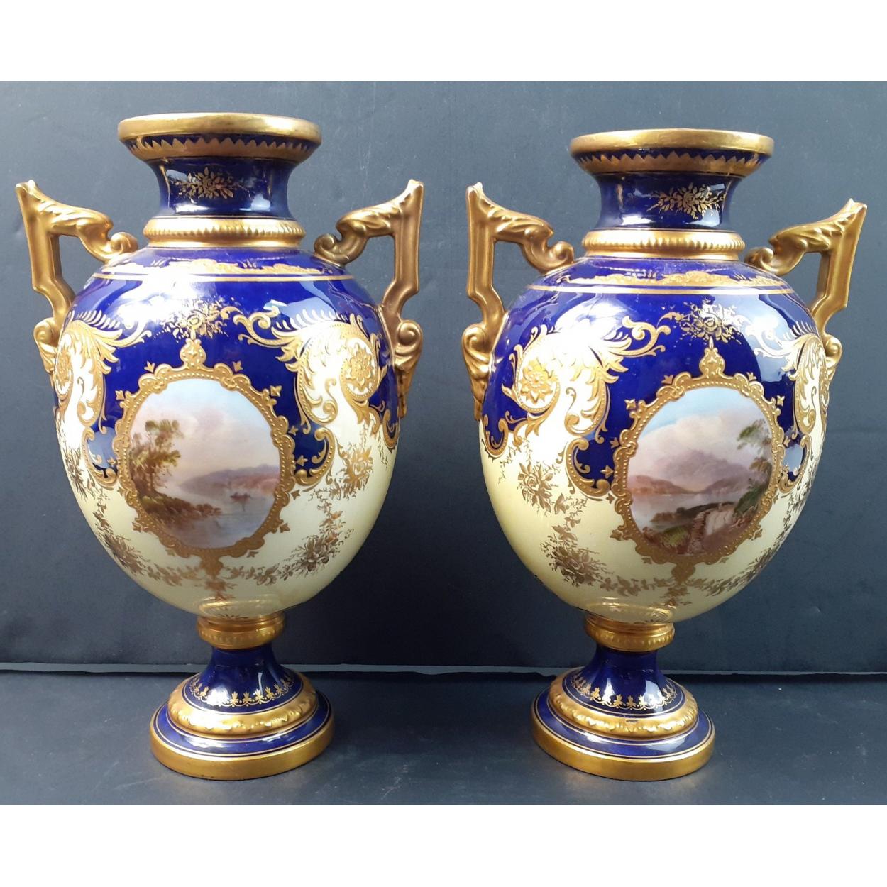 Two quality COALPORT painted panel urns (304607) each 22cm high approx