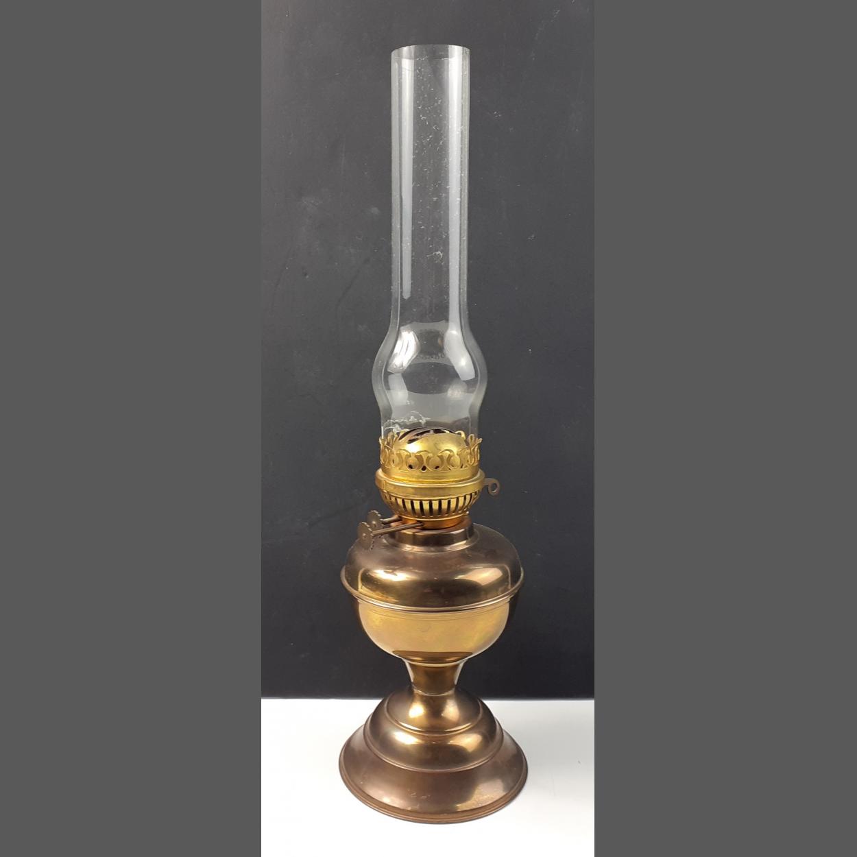 A brass oil lamp, chimney in good condition. Fifty cm tall approx.