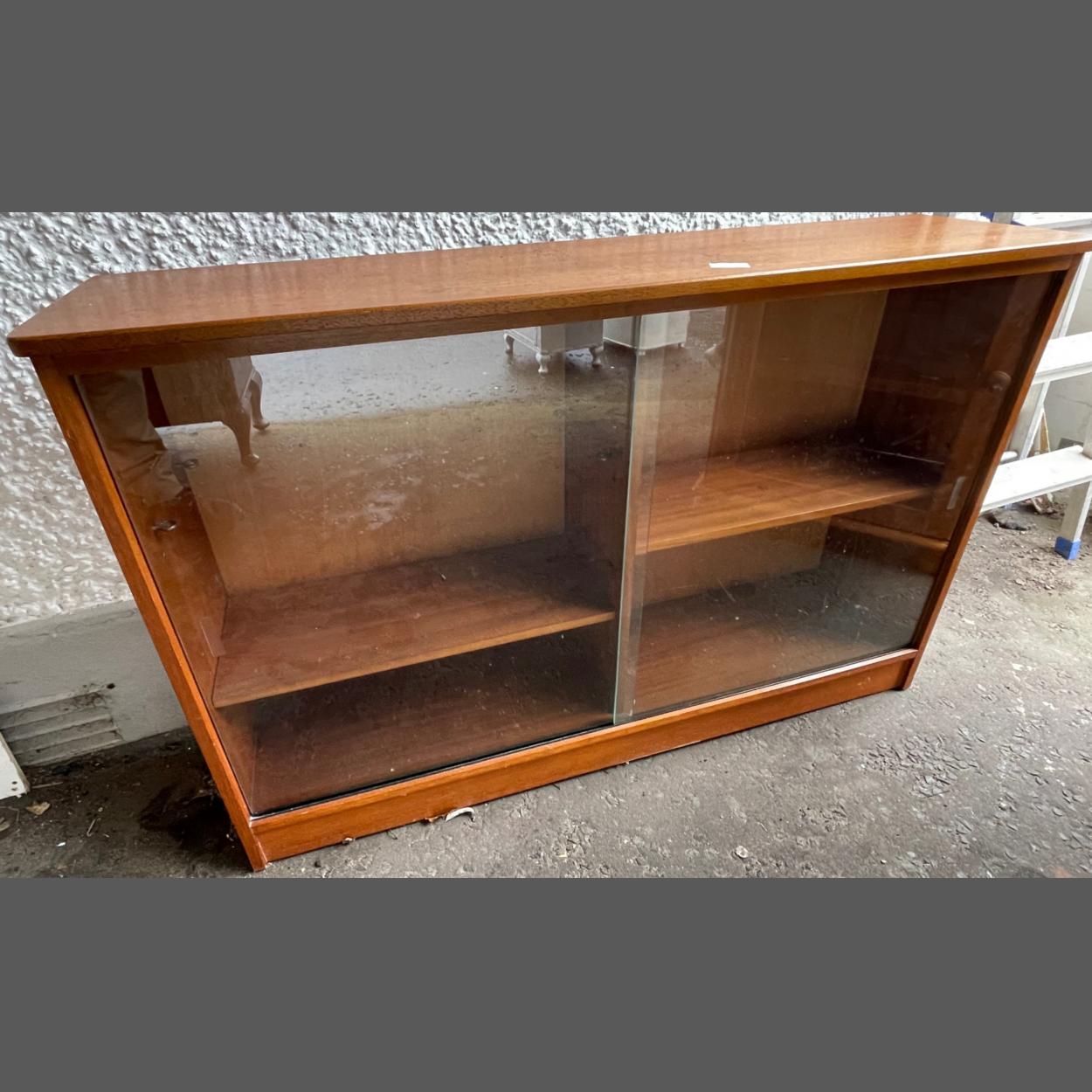 A glazed VINTAGE TEAK bookcase - 3ft width x 10" depth x 4ft height approx