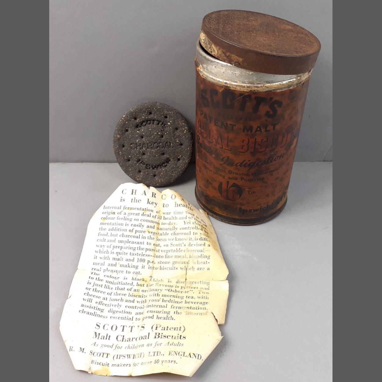 An amazing survivor! An original tin of SCOTT'S Patent Malt Charcoal Biscuits for indigestion. Original biscuits and information sheet in tin. Circa1930's.