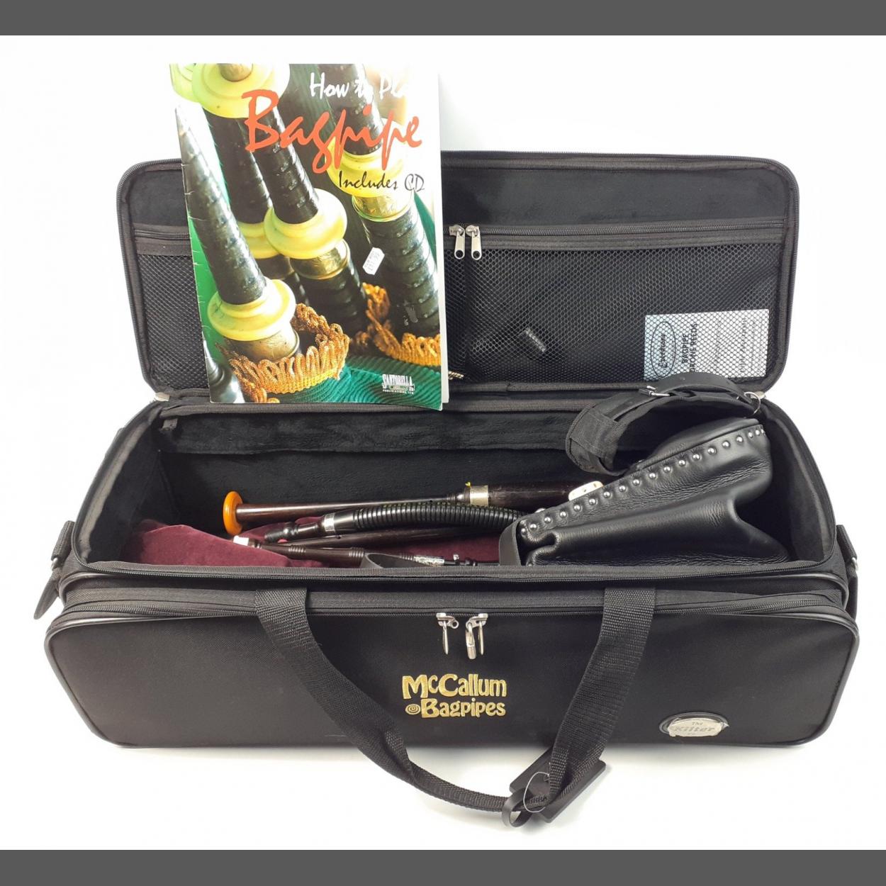 A set of MCCALLUM Northumbrian style pipes, inscribed Louise & Billy in a McCallum bag along with a practice chanter (A/F)