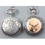 A pocket watch lot to include a modern mechanical with lion rampant case, on an Albert with various non-precious charms, and one quartz with an attractive stag motif.