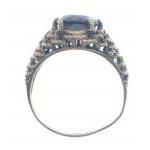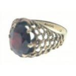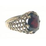 An impressive ring set with a large ruby stone (12mm long approx) secured with claws and with a basketweave surround size M, gross weight 3.27