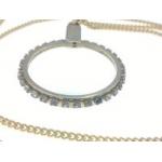 A magnifying glass (35mm dia approx) surrounded by clear stone and attached to a 44cm gilt chain