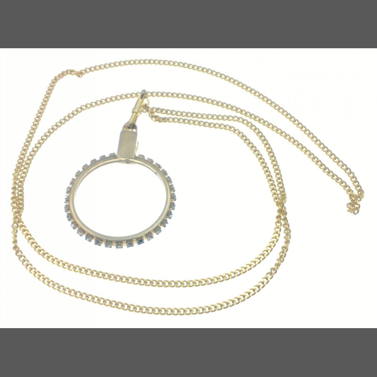 A magnifying glass (35mm dia approx) surrounded by clear stone and attached to a 44cm gilt chain