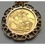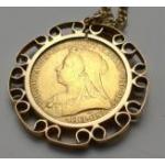 A FULL 1893 Victorian old head gold sovereign set in a pendant mount stamped 9ct/375 and suspended from an unmarked chain 76cm long approx. Weight of coin and mount 10.8g approx