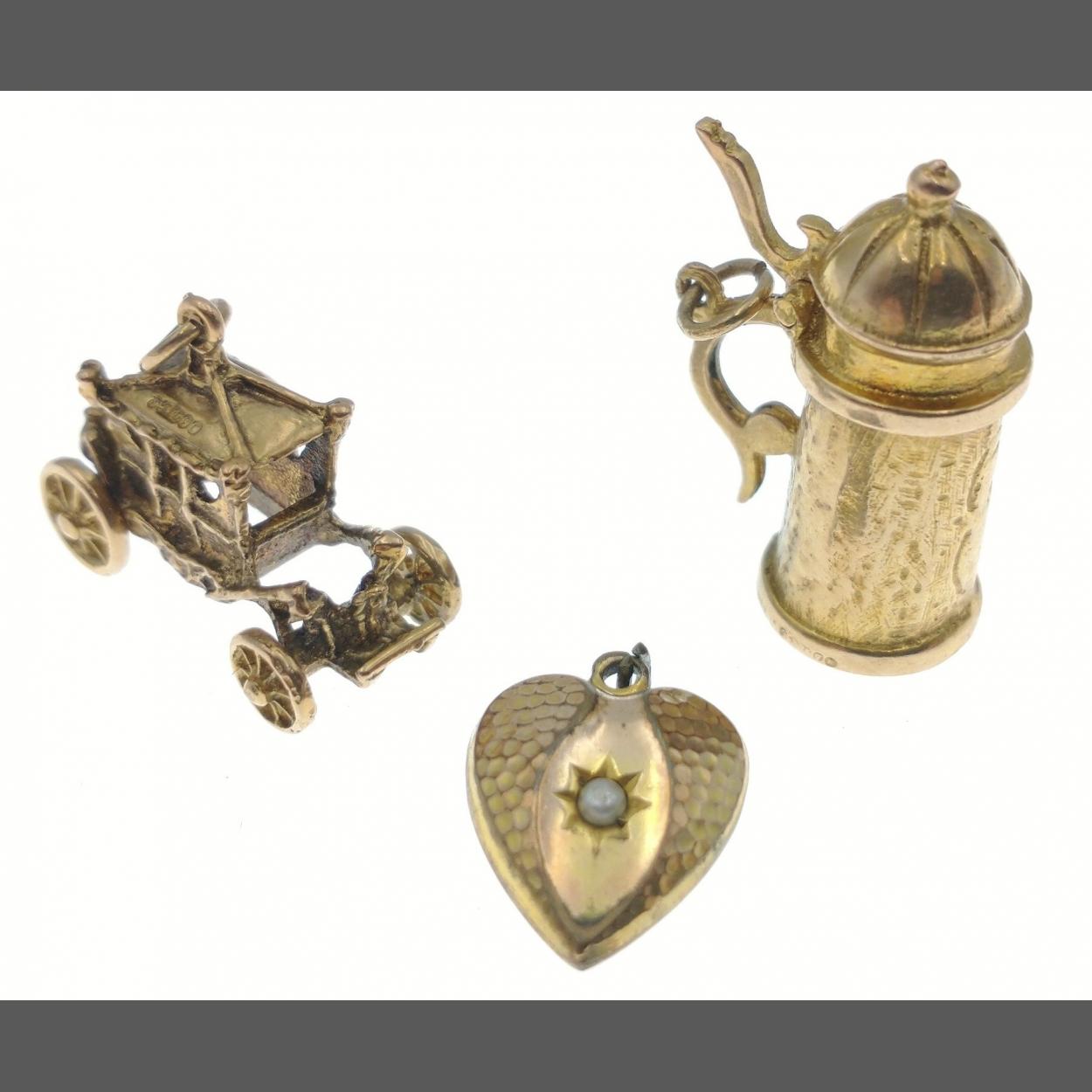 Three bracelet charms to include a tankard (25mm approx), a carriage (20mm approx) both with marks (weight 10.58g approx), plus a heart-shaped locket