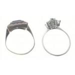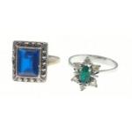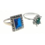 Two rings, one set with a blue stone (10mm long) and marcasites, size N and one other set with a green stone and surrounded by clear stones, size Q