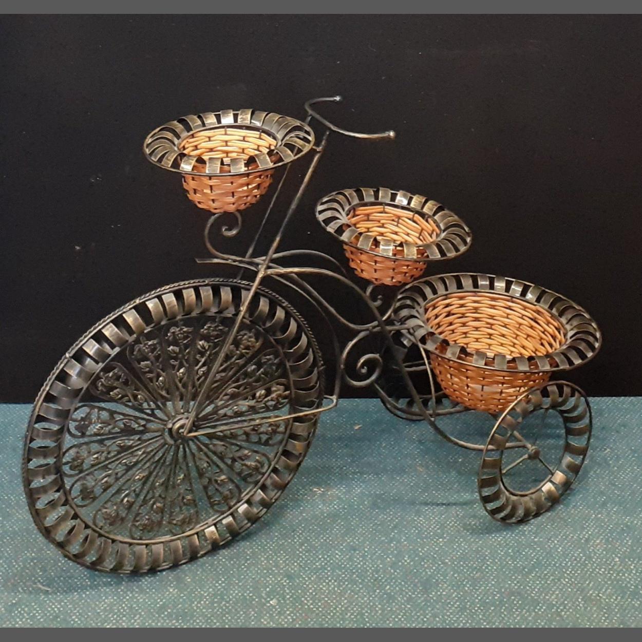 An attractive unusual tricycle plant stand with three wicker baskets 67Hcm x 98Lcm