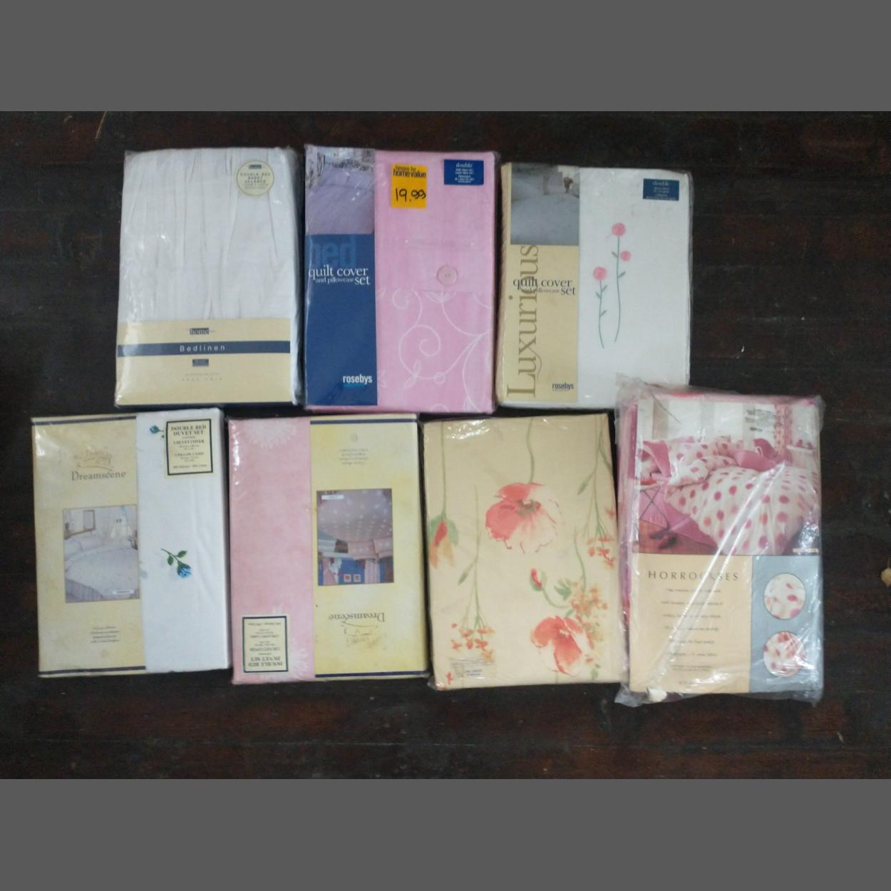 A box of household linens unused and in original packaging, to include 6 double size duvet cover and pillowcase sets, and one double size valance sheet