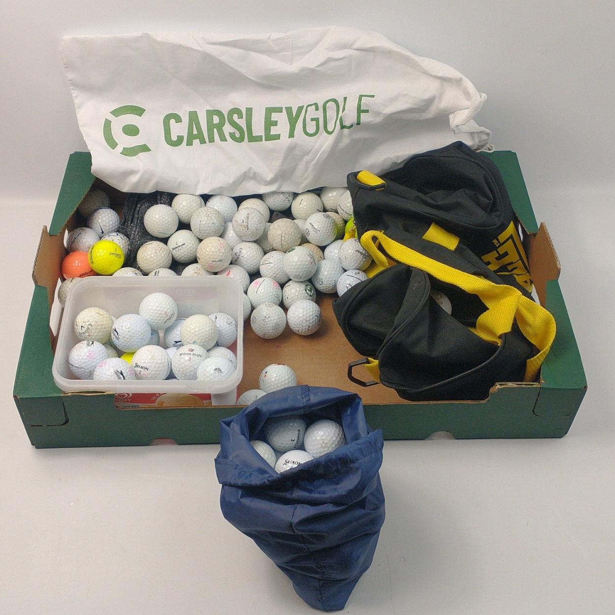 A great box of mainly used golf balls and golf ball bags