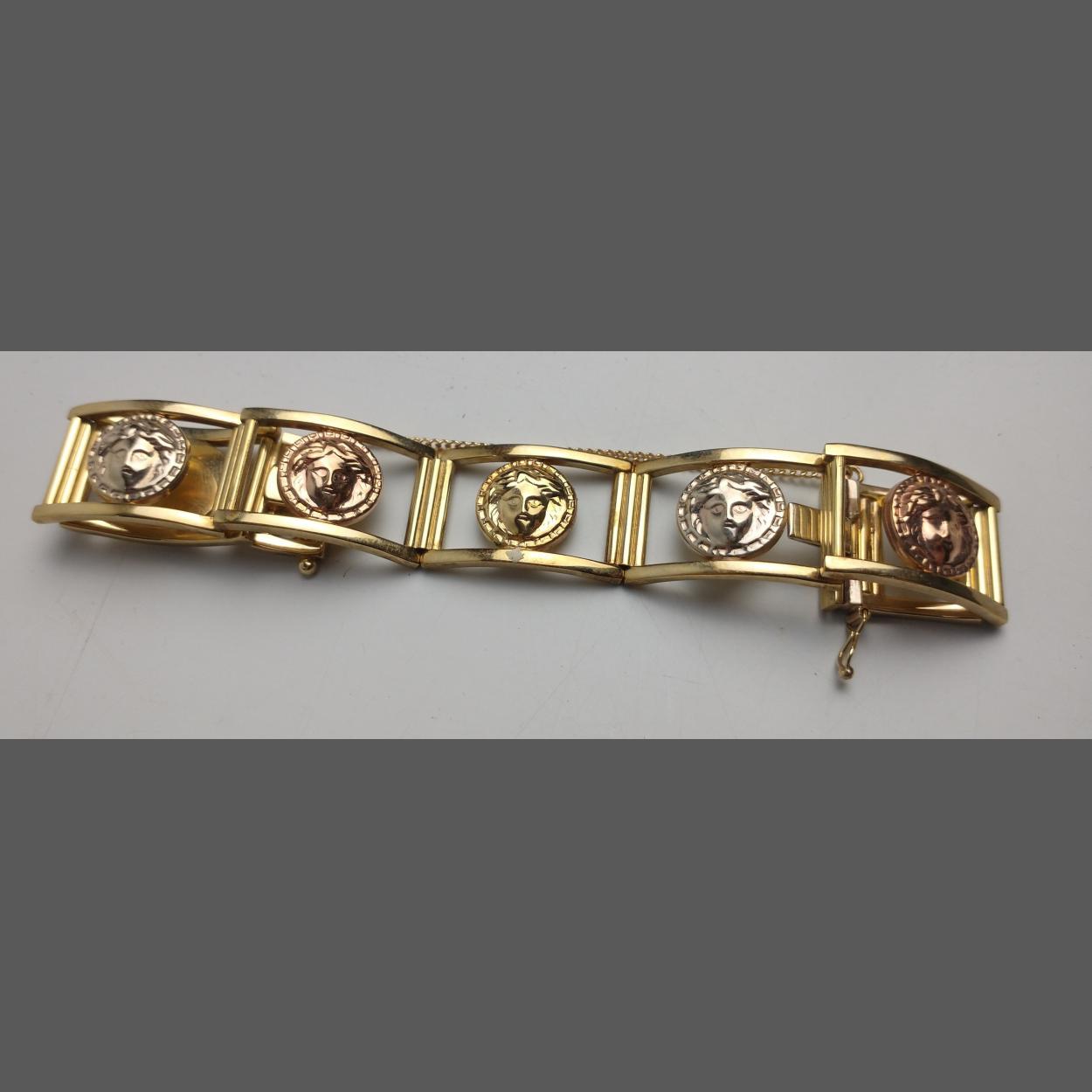 A 375 stamped yellow gold bracelet with tri-colour medallions, 19cm approx, 24.95g approx