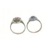 A hallmarked Edinburgh ring, stamped 375 by CL&S set with cubic zirconias and a central purple stone, size O, gross weight 2.75g approx and also a ring 18ct plated set with a red stone surrounded by clear stones, size M,