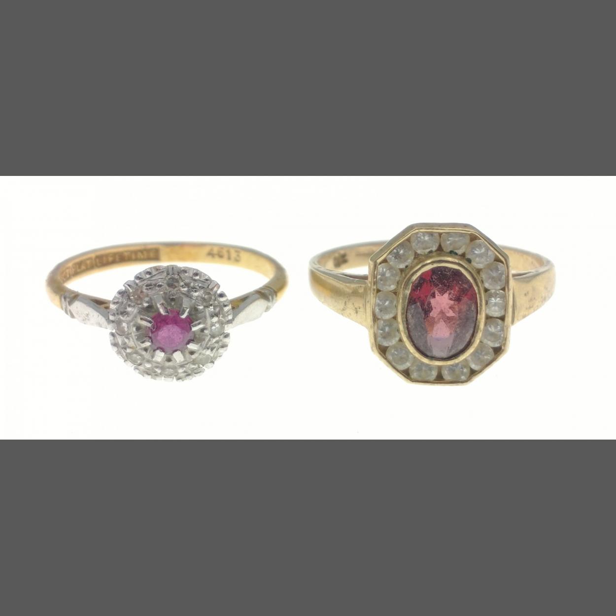 A hallmarked Edinburgh ring, stamped 375 by CL&S set with cubic zirconias and a central purple stone, size O, gross weight 2.75g approx and also a ring 18ct plated set with a red stone surrounded by clear stones, size M,
