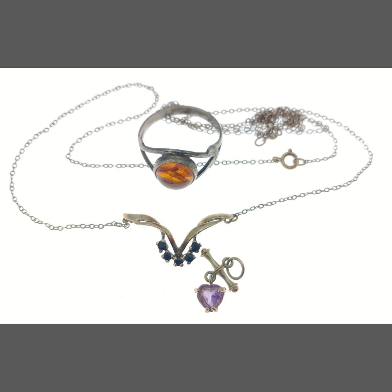 A 375 stamped pendant with dark coloured stones with an adjoining tangled chain stamped 9c, gross weight 2.63g approx also with a costume ring and one earring with purple stone
