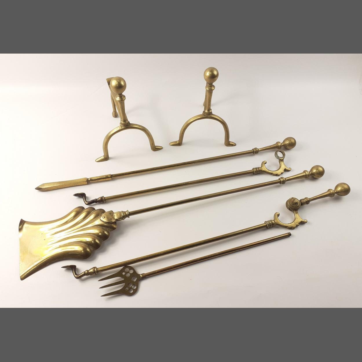 A set of Edwardian brass fire irons with stand with a few ends missing