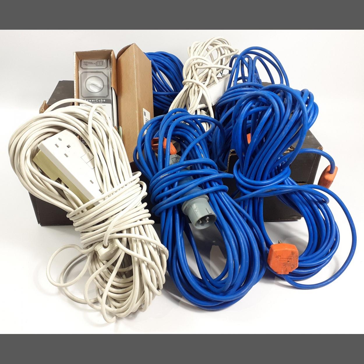 A mixed box containing various power tool cables, possible gardening machinery, a power cube extension block
