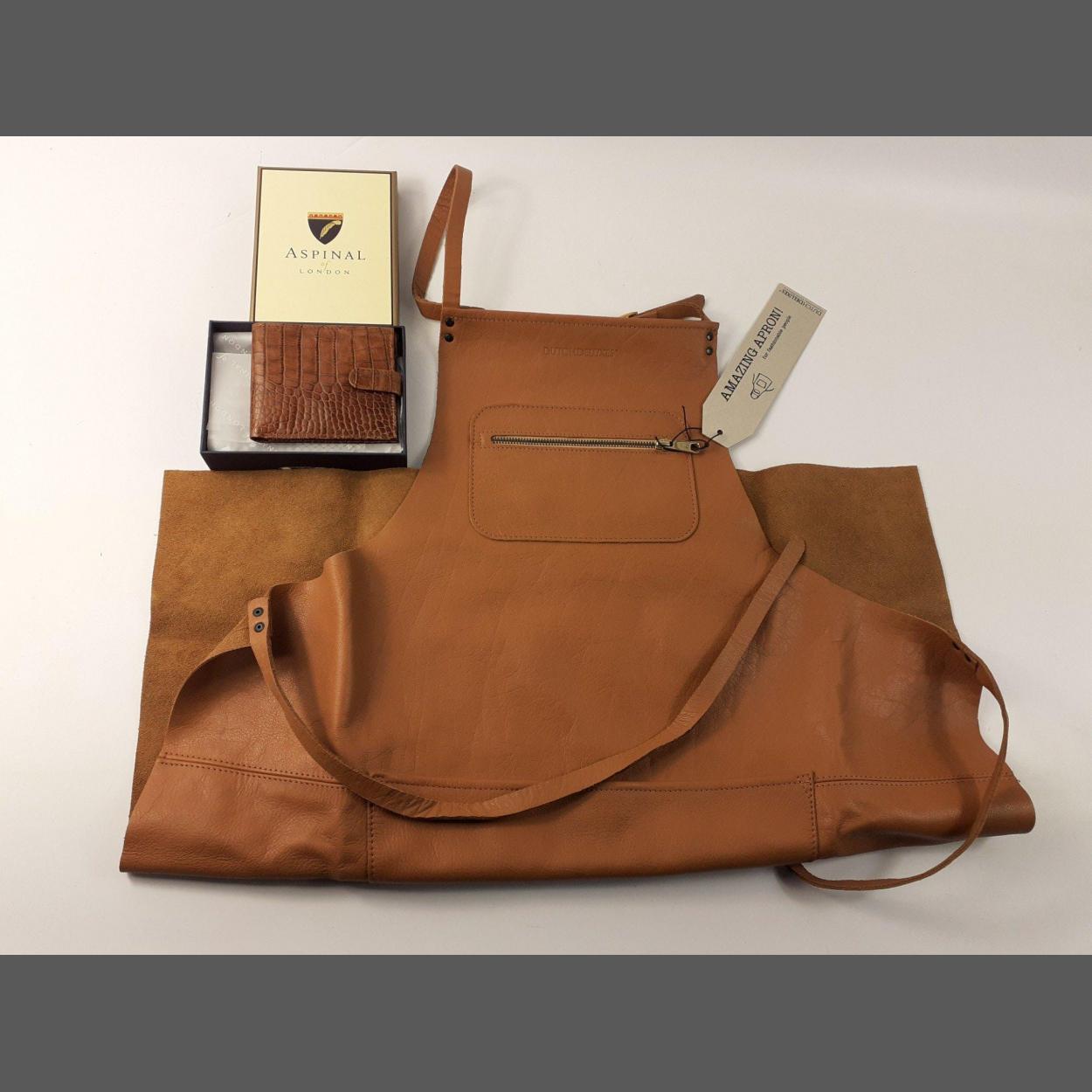 An AMAZING APRON for fashionable people by Dutch de Luxes and an ASPINALL of London boxed gent's handkerchief and a HARROD'S gentleman's wallet