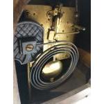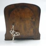 An antique wooden Threepenny mantel clock supplied with key, in generally good condition, 23cm tall approx