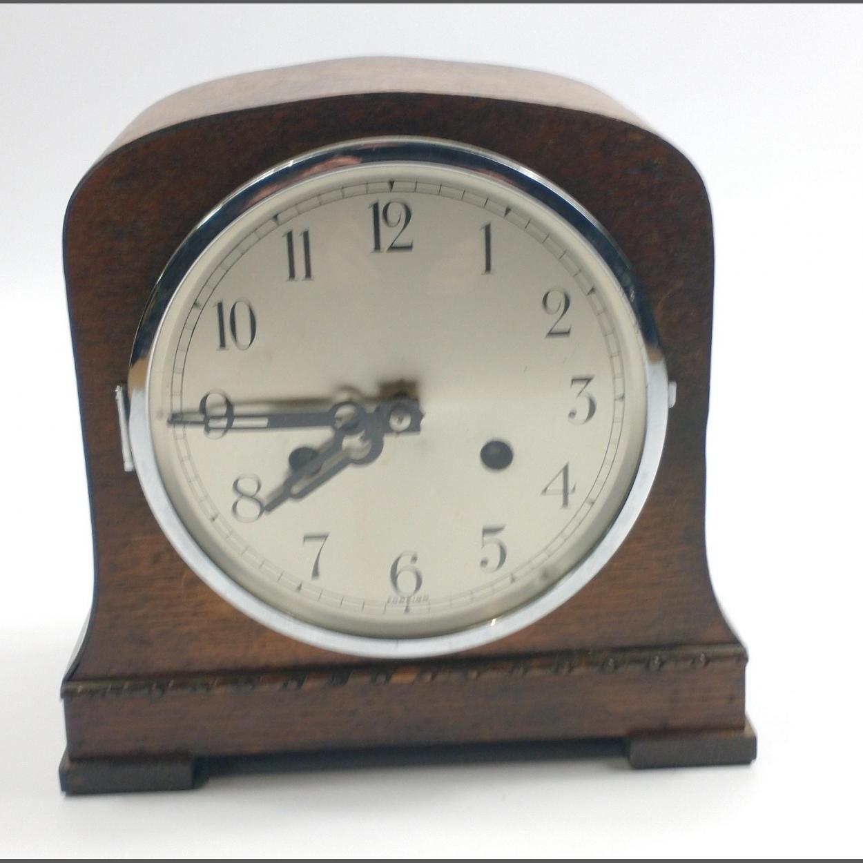 An antique wooden Threepenny mantel clock supplied with key, in generally good condition, 23cm tall approx