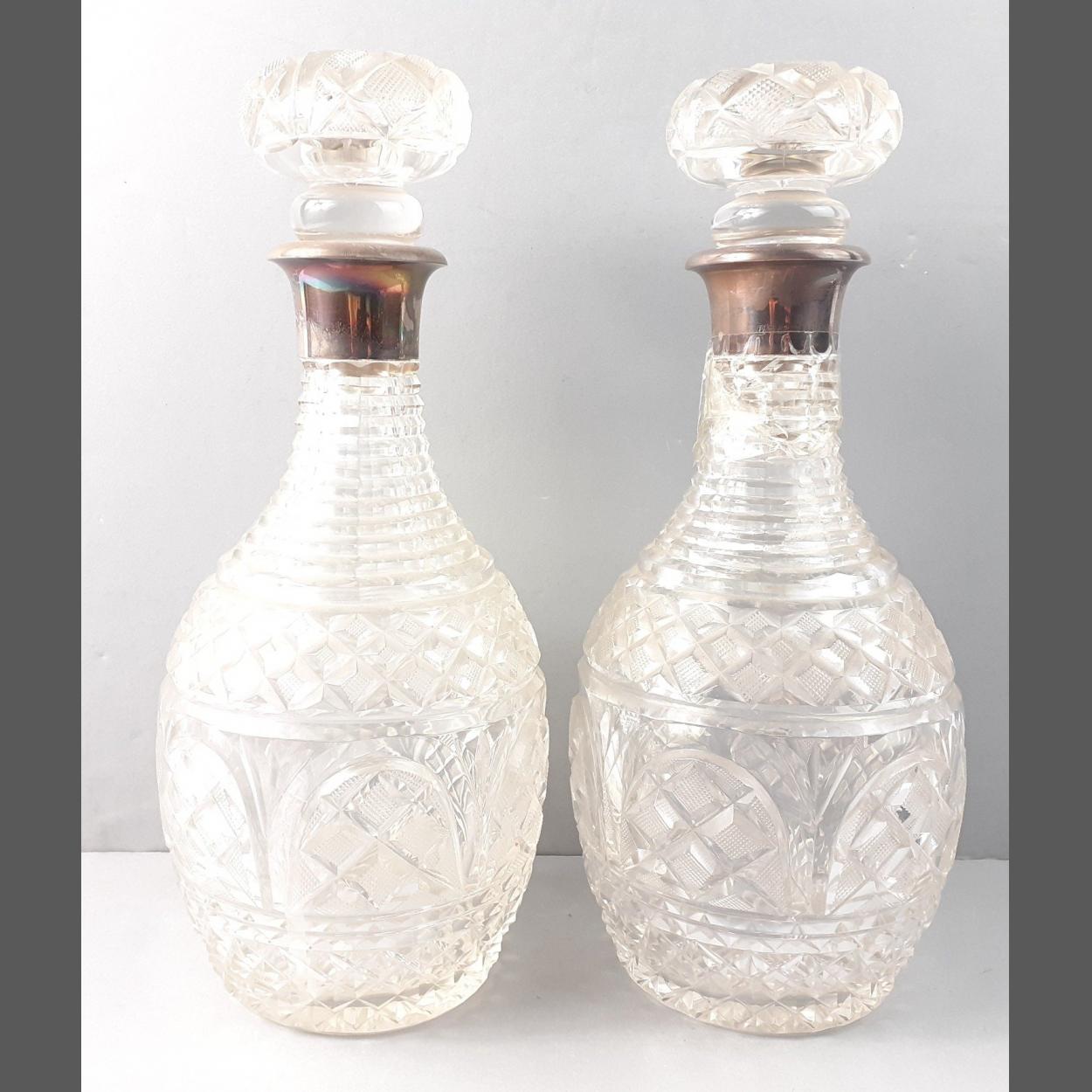 Two cut glass decanters with stoppers and silver collars hallmarked Birmingham 1946, each 29cm tall. One severely damaged