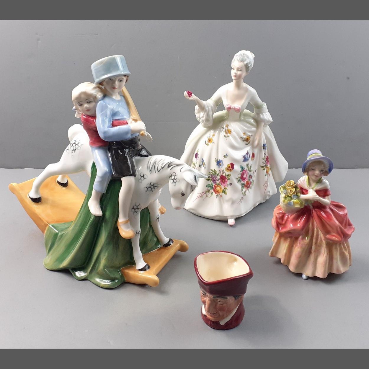 A selection of ROYAL DOULTON figures including Diana (HN2468) 20cm tall, Cissy (HN1804) 13cm approx, and a small Doulton character jug and Hold Tight (HN 3298)(damage repaired in a number of places.)