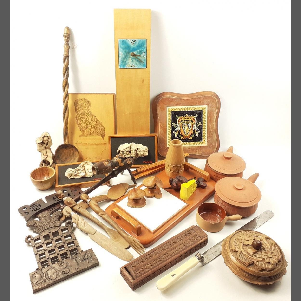 A wooden collection to include, clocks, plaques, decorative items, and others. Much of interest