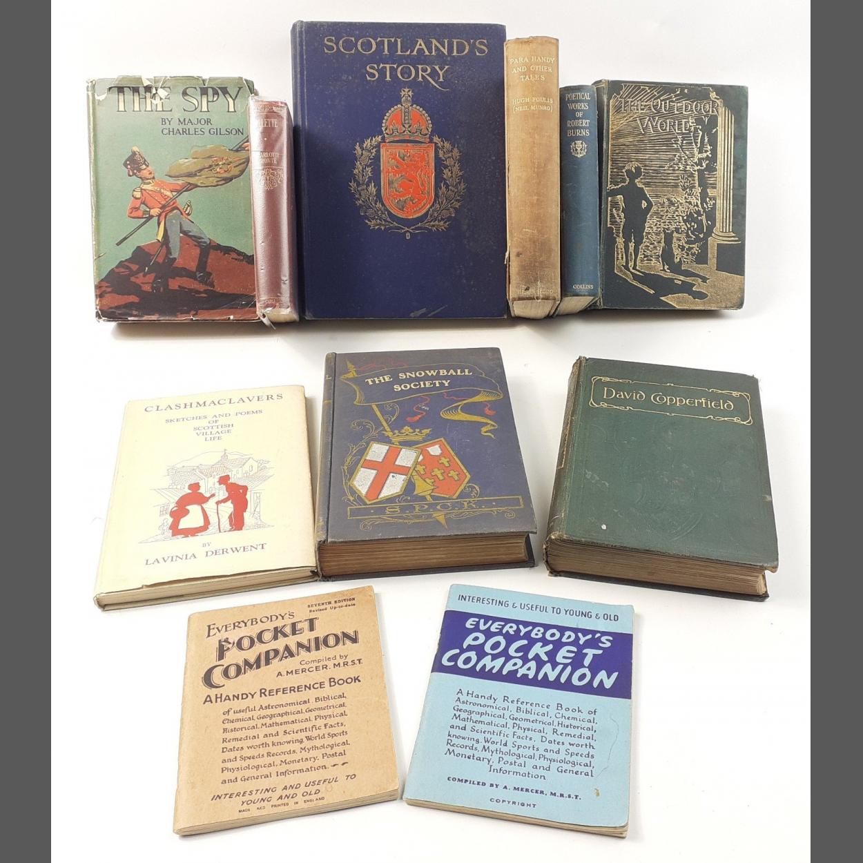 A small collection of vintage books including SCOTLAND'S STORY by HE Marshall, THE SPY by Major Charles Gilson, THE SNOWBALL SOCIETY by M Bramston, CLASHMACLAVERS first edition by Lavinia Derwent, THE OUTDOOR WORLD by W Furneaux(1900), EVERYBODY'S POCKET COMPANION complied by A Mercer and others