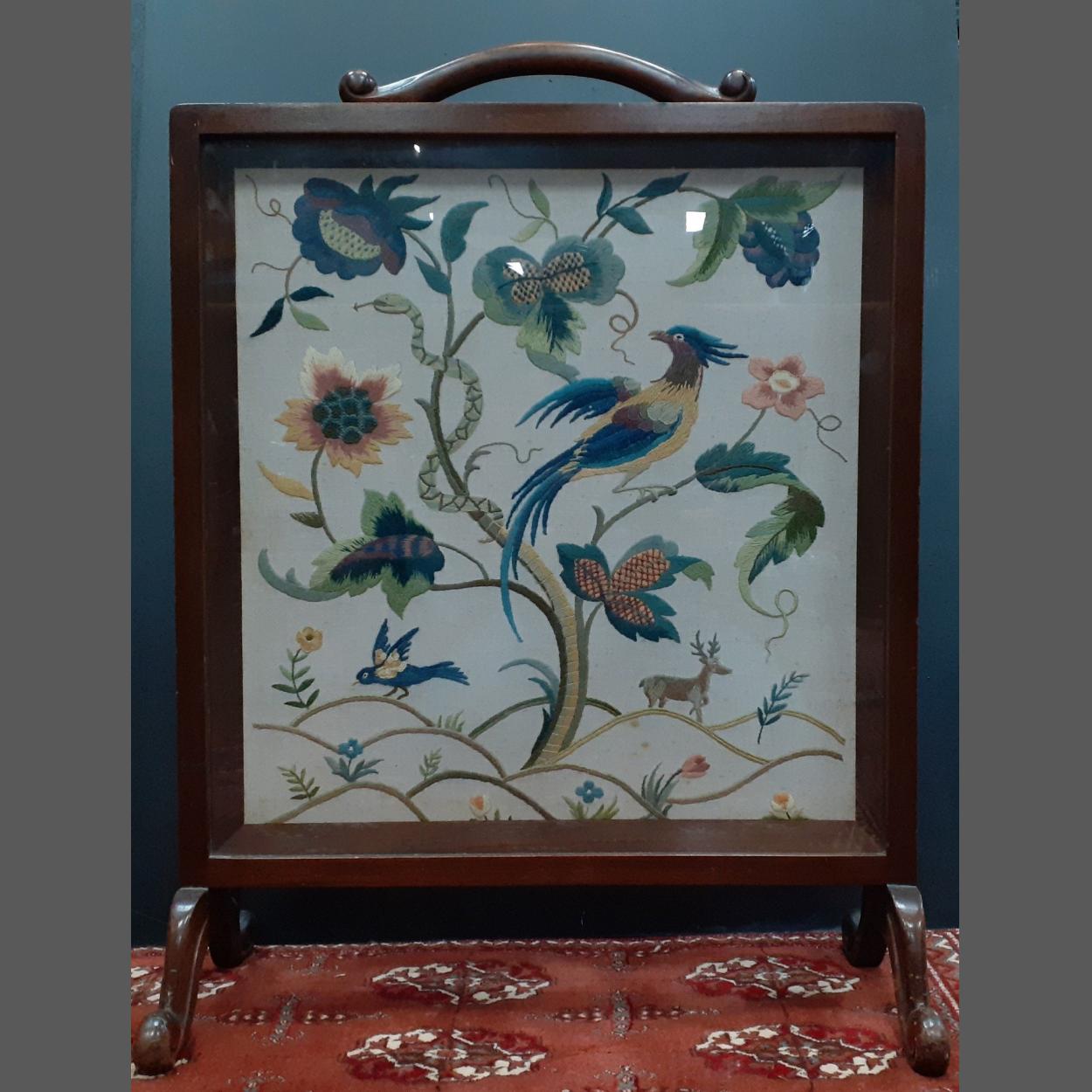 A FINE HANDMADE mahogany fire screen with beautifully executed embroidered bird of paradise and snake, 72cm tall approx