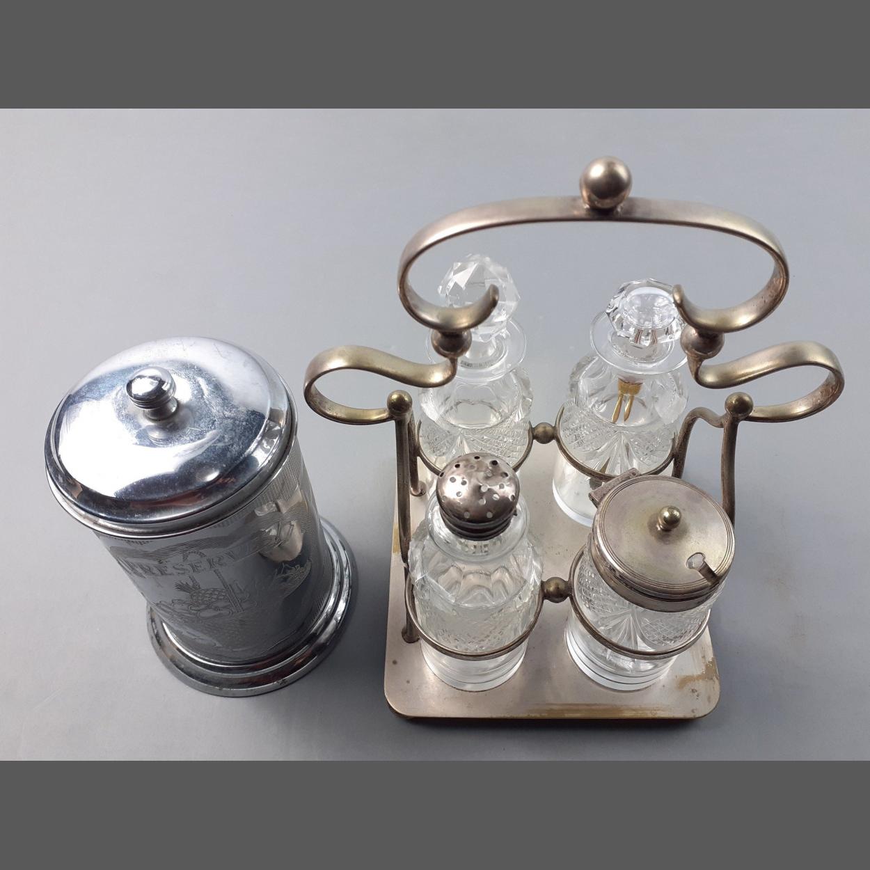 Cut glass, silver plated condiment set including a preserves cannister. All in good usable condition.