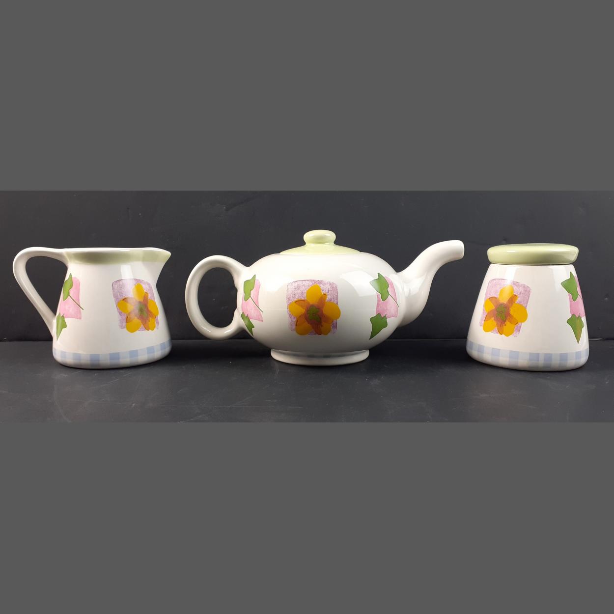 A pretty modern teapot with sugar and cream