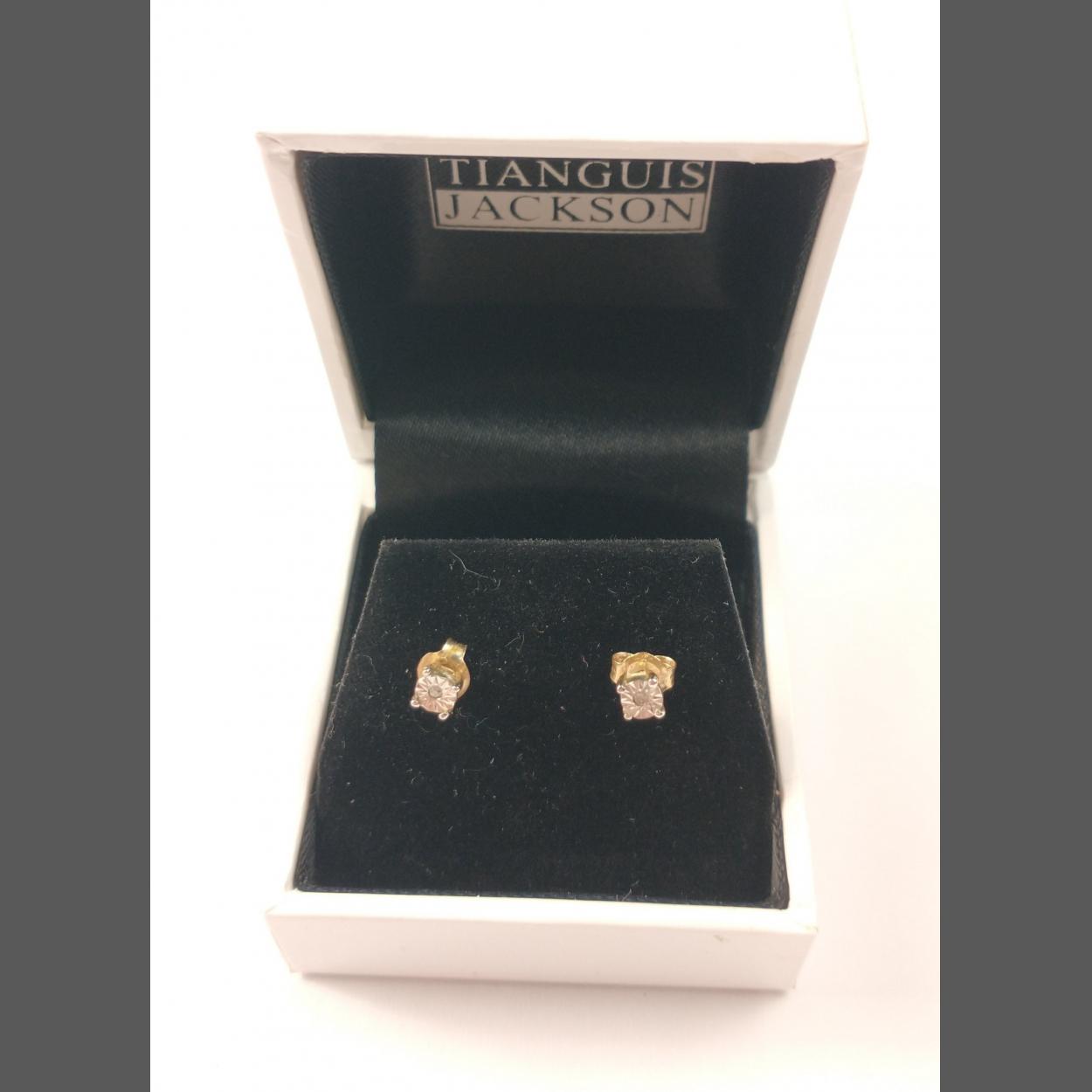 A boxed set of 9K gold stamped diamond (tested) earrings. One butterfly missing.