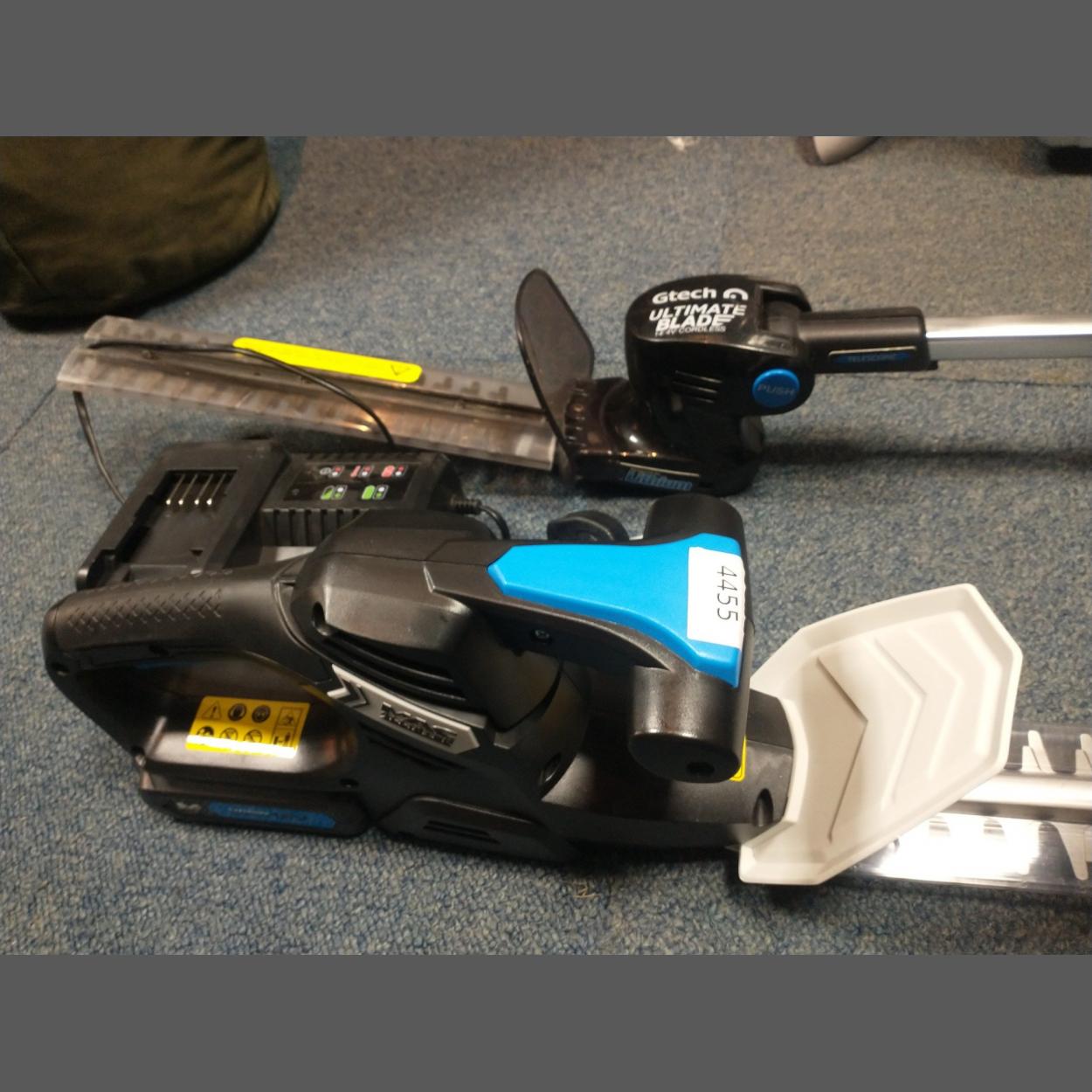 A GTech Ultimate Blade cordless hedge trimmer without charger cable(available to order from Amazon). A MacAllister hedge trimmer with charger.
