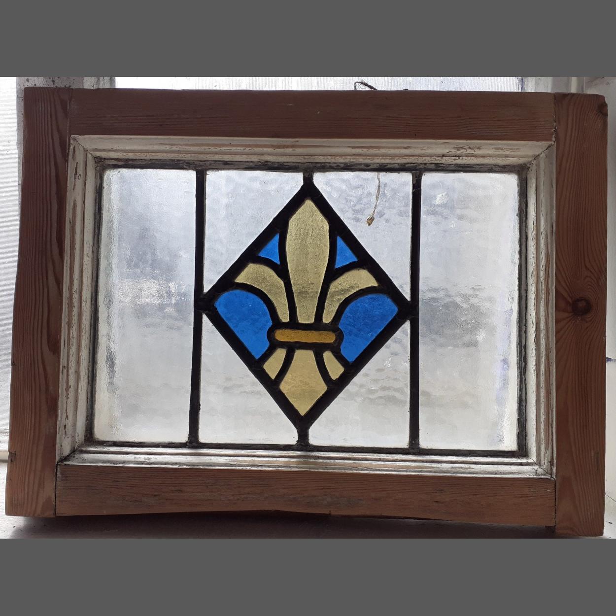 A recovered stain glass panel with Fleur de Lys pattern. Measure 43 x 31 cm approx.
