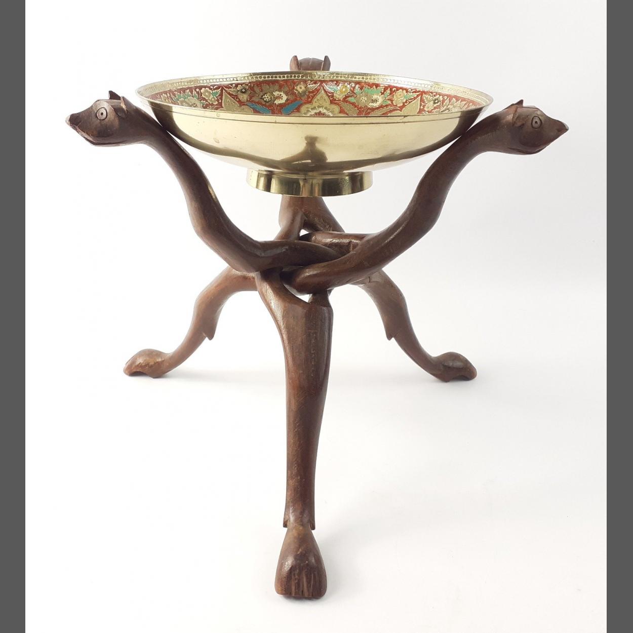 An all-in-one wooden carved cat head stand (30cm tall approx), with an elaborately decorated Asian brass bowl 25cm dia approx