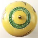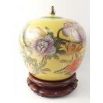 A beautiful large Oriental ginger jar with yellow gilt ground and floral peony detail, complete with carved wooden base and lid (with intact finial) standing 30cm tall. No damage