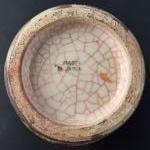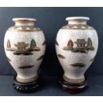 A pair of crackleware Satsuma style urn vases, each 24cm high approx. Come with unmatched wooden bases.