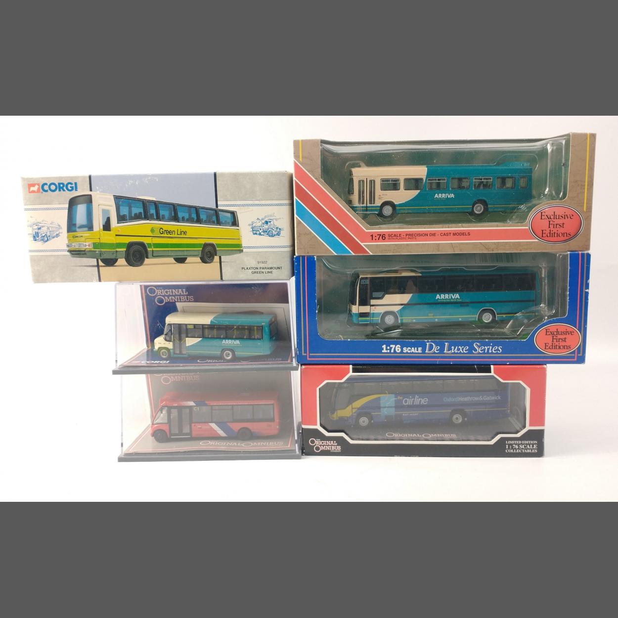 A small collection of diecast buses to include EFE x 2, CORGI original omnibus, CORGI 91922 Plaxton, and 2 others