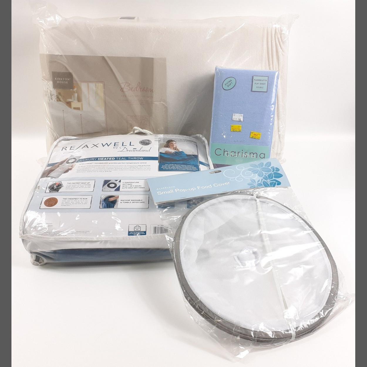 A soft furnishing lot to include KIRKTON HOUSE bedroom leg support cushion, brand new in packet, a DREAMLAND throw in packet, flannelette double flat sheet and a pop-up food cover