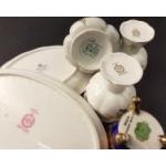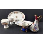 Two MINTON Marlow beakers 8cm high x 7cm diameter with matching trinket dish (21cm long), a BAVARIAN 3 legged beaker with heavy gilt decoration, a small MEISSNER of Limoges ewer (14cm high ) and a RICHMOND Wild Anemone trinket dish (21cm long). No damage.