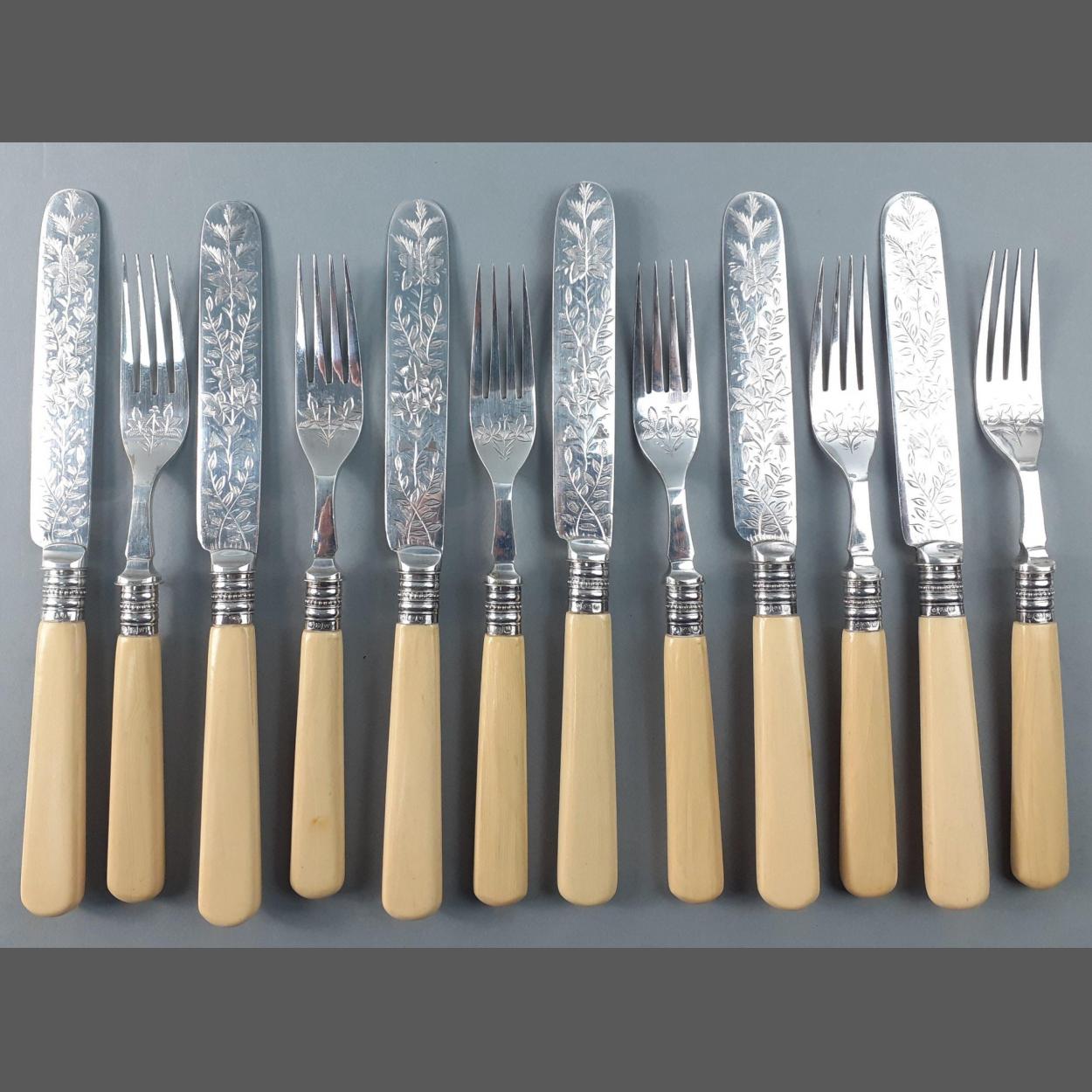 A set of six each of attractively designed dessert knives and forks, hallmarked for Sheffield 1939 on bolsters, gross weight 450g approx